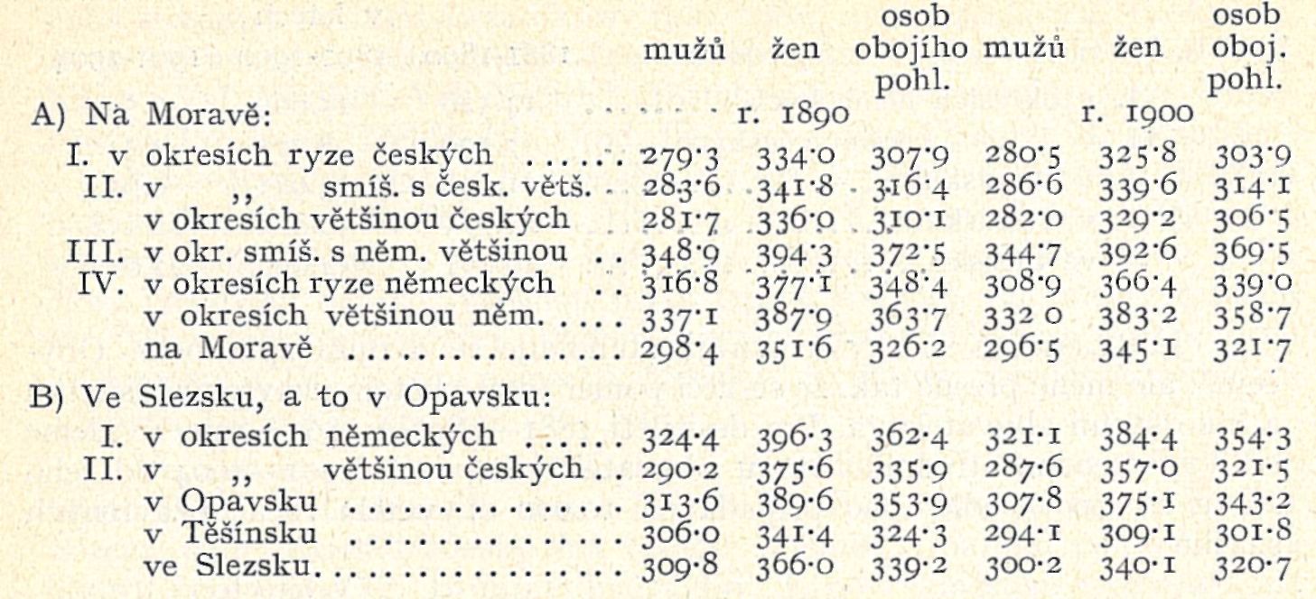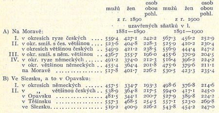 V obou přehledech právě podaných jsou rozdíly mezi územími jednotlivých národností docela patrné. Osob které mohou vstoupiti v manželství, jest nejvíce v okresích německých: 35-87% na Moravě (a to 33,90% v ryze německých a 36,95% ve smíšených s německou většinou) a 3543% ve Slezsku, kdežto v českých okresích Moravy jest jich jen З0'б5% (30^39% v ryze českých, 31,41% ve smíšených s českou většinou) a ve většinou české části Opavska 32-15%; nejméně takových osob čítá většinou polské Těšínsko (30'i8%). Všude jest mužů, kteří mohou uzavřití sňatek, mnohem méně nežli žen, nejmenší rozdíl mezi obojím pohlavím jest vTěšínsku, což však působí uhelná pánev v okresu fryštátském se silným přistěhováním mužů.