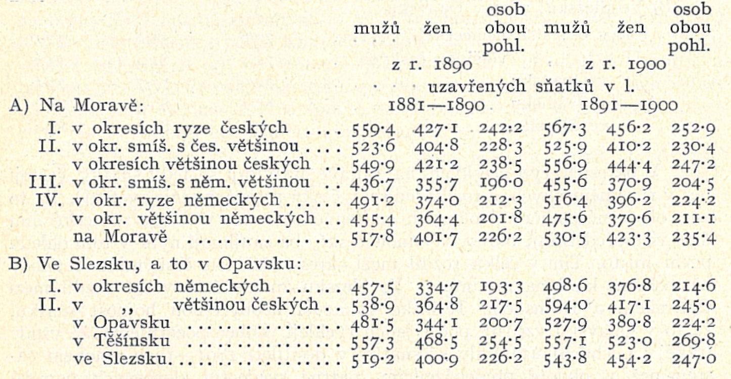 Poměr pak mezi množstvím uzavřených sňatků a počtem osob, jež sňatek mohou uzavřití, určí nám sňatkovou četnost. A přirovnávám počet sňatků z období 1881—1890 к počtu oněch osob z r. 1890 a obdobně z desítiletí 1891—1900 к jejich počtu z r. 1900, jsa si dobře vědom, že nedocílím tím úplné přesnosti; než nám běží hlavně o srovnání jednotlivých území a aspoň částečné zachycení ..vývoje, a v obojím ohledu doděláme se výsledků docela spolehlivých.
