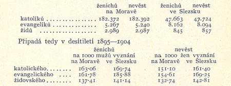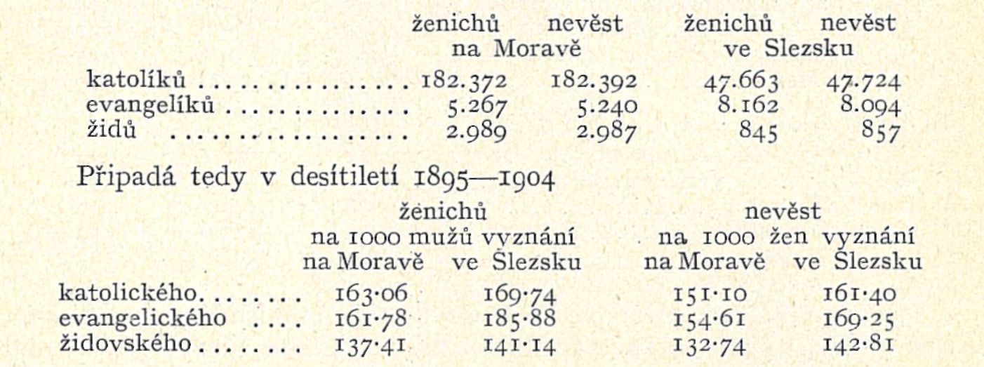 Statistika rakouská přihlíží konečně ještě к náboženství snoubenců. Všimneme si. ovšem jen tří skupin, které četněji jsou zastoupeny mezi obyvatelstvem moravským a slezským: katolíků (řím. a řec), evangelíků (ref. a augsb.) a židů. Ostatní svým nepatrným počtem úplně ustupuji do pozadí.