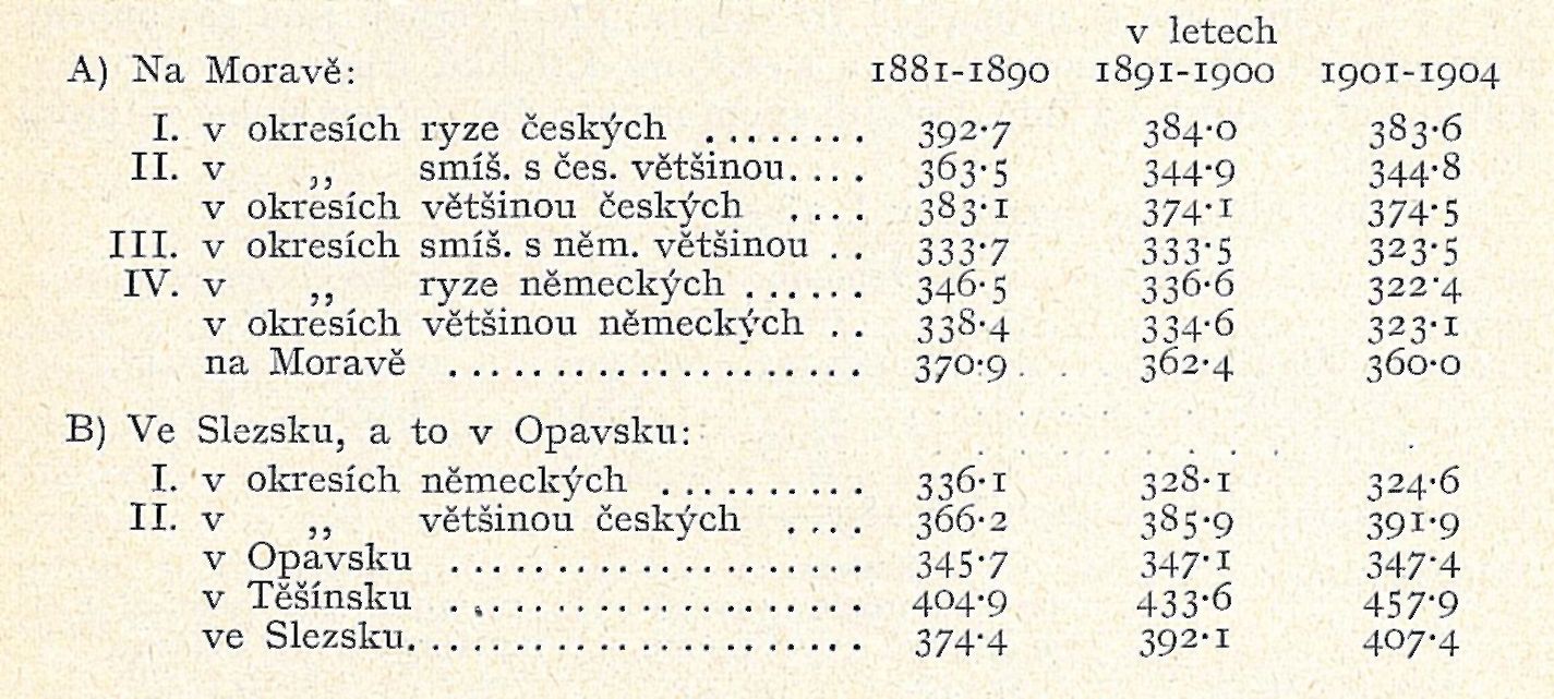 1 německém- porodů poměrně ubývá přes to, že vstupuje se více v manželství. Zjev ten není snad jen omezen na Moravu a na Čechy, jak ukázal Rauchberg, nýbrž jest možno jej pozorovati ve všech kulturních státech. Ve Slezsku ubylo porodů pouze v německých okresích (a to i absolutně); v území českém a polském za to jich stále rozhodně přibýrvá. To pak působí ta okolnost, že následkem přistěhování mladých lidí zvláště do uhelné pánve prostřední věkové třídy nabývají v nich stále větší převahy nad ostatními, čímž natalitní cifra se zvyšuje.