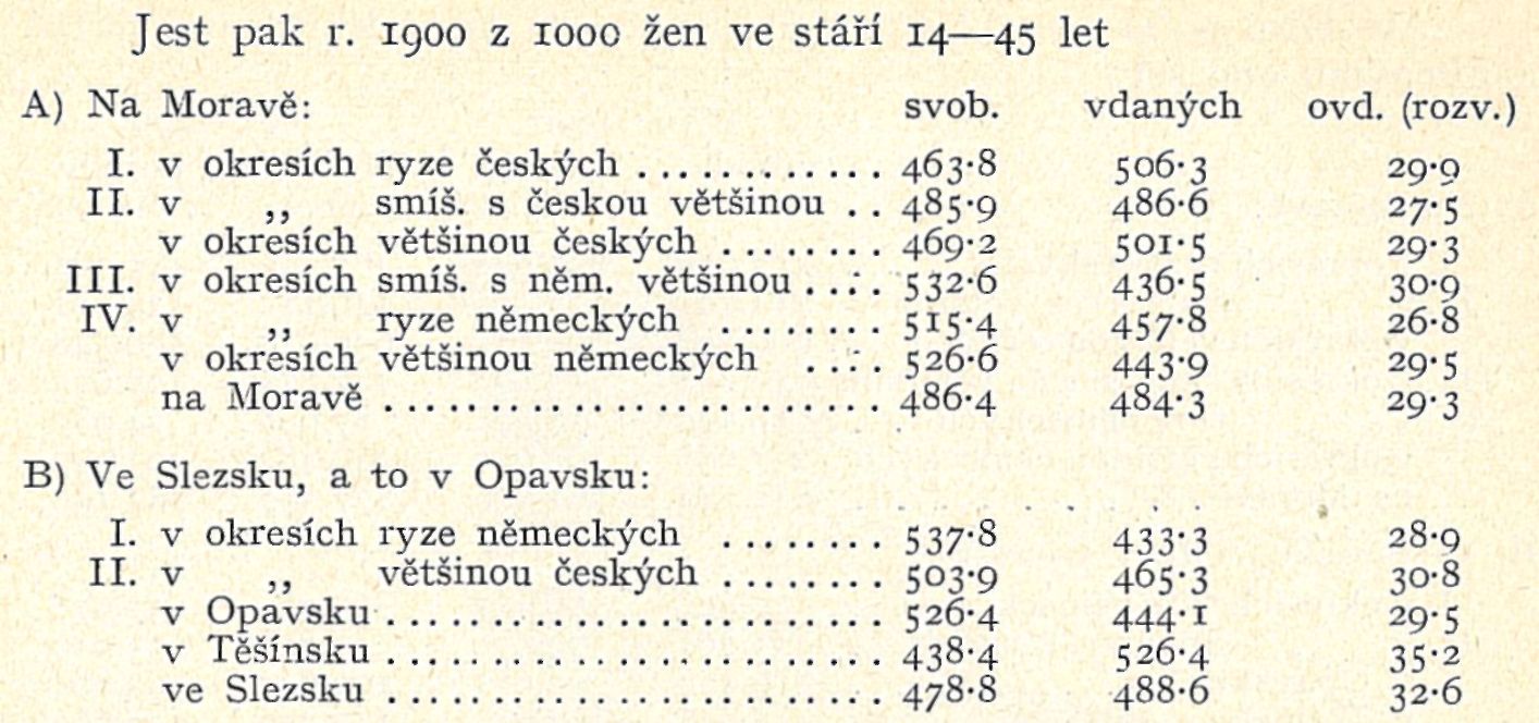 Rozumí se, že výsledek jest týž, к němuž jsme dospěli, když jsme rozebírali sňatečnou četnost. Svobodných žen, jež mohou roditi, mají nejvíce okresy německé, což samo sebou bude působiti na snížení plodnosti v nich, nejméně většinou polské Těšínsko, uprostřed stojí území české. Kdybychom čísla pro jednotlivé okresy zakreslili na mapku, viděli bychom, že nízkou kvótou svobodných žen odlišují se okresy slovácké; že u kmene slováckého doba uzavírání sňatku nastává mnohem dříve nežli jinde, bylo již řečeno. Jinak ale tato mapka namnoze nesouhlasila by s mapkou znázorňující četnost sňatkovou. Zejména Morava jihozápadní má mnohem méně svobodných žen než severní. Působí tu asi velice silné vystěhování do Vídně z Moravy jihozápadní,*) jehož se hojně zúčastní, jak ze zkušenosti známo, svobodná děvčata, nastupující na místa služebných ve Vídni. Také na této mapce možno by bylo konstatovati národnostní rozdíly u okresů jihomoravských; v německých nebo smíšených (Mikulov, Znojmo, Mor. Krumlov) jest kvóta svobodných žen značně vyšší než v sousedních českých, ačkoli stěhování do Vídně jest právě z nich nejintensivnější. Vidím v tom podporu svého tvrzení, že za stejných podmínek uzavírají Němci sňatek později než Čechové. Ze nejnižší kvótu svobodných žen vykazují oba okresy uhelného revíru, jest při silném přistěhování mužů do těchto okresů pochopitelno.