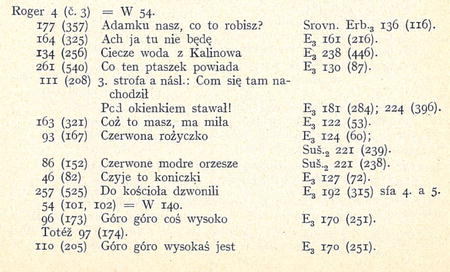 Již Zíbrt poznamenal ve svém Bibl. přehledu str. 89, že „písně mnohé v této sbírce ,lidu polského' ve Slezsku jsou totožné s písněmi českými" a uvedl 3 příklady. Sestavil jsem všechny písně shodné s našimi a srovnal se sbírkou Erbenovou a tu a tam Sušilovou. Připojuji tento seznam zde; může býti jakýmsi doplňkem. Nemohu ovšem uváděli obšírně ostatních variantů československých a polských, ježto i tak již referát příliš vzrostl. U písní, jež jsou obsaženy v „Katalogu", odkazuji na řadové číslo jeho. (Katalog označuji pism. W.)