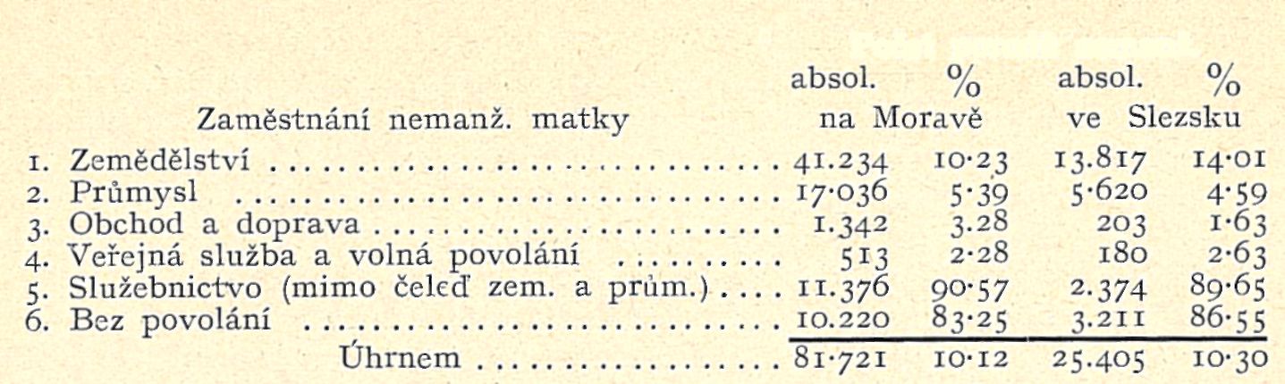 Z prvních 4 skupin zaměstnání má zemědělství nejvyšší kvótu nemanželských porodů a, i kdybychom nemanželské děti 5. a 6. skupiny rozdělili mezi skupinu 2., 3. a 4., nedosáhne žádná z nich výše skupiny první: v obou zemích rodí se mezi zemědělci nemanželských dětí více, nežli činí průměr zemský. Kdybychom přihlíželi к zaměstnání, pak bychom čekali u Němců spíše méně nemanželských porodů než u Čechů..