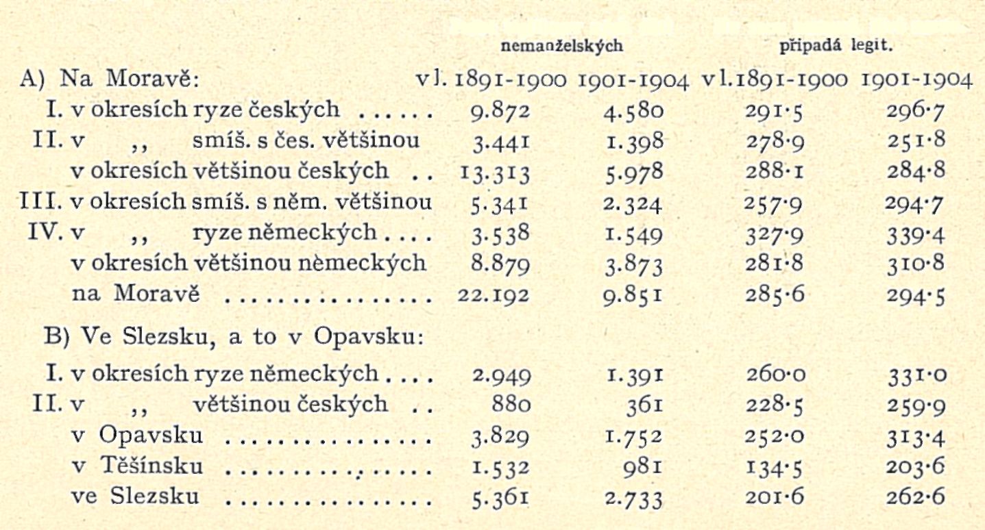 Krátce, jejich množství není možno vyložiti jinak nežli kmenovými zvláštnostmi. Rozdíl mezi obyčeji a zvyklostmi Čechů a Němců jeví se nám tu zcela zřetelně. Rekl jsem již, že nejvýš pravděpodobně v menší četnosti sňatkové u Němců proniká zvláštnost národní povahy německé nebo, chce-me-li, národních zvyků německých: Němci za stejných poměrů žení a vdávají se později než Čechové. S tím pak zajisté v nejužší souvislosti jest časté vyskytování se nemanželských porodů. Zjev ten není omezen jen na Moravu a Slezsko, jest také v Čechách a v míře ještě větší v zemích alpských a jest z pozdního uzavírání sňatků docela vysvětlitelný.