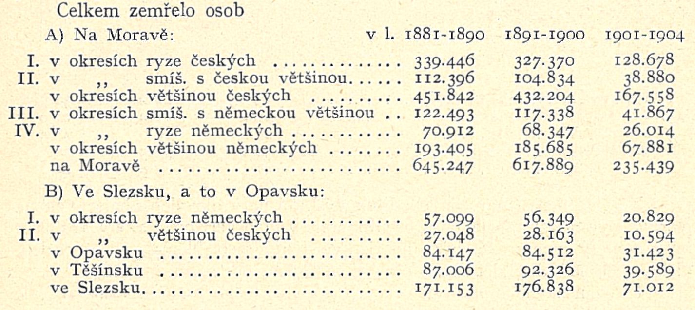 Nej důležitější úkaz, který z těchto číslic můžeme vyčisti, jest ten, že úmrtnosti na Moravě i ve Slezsku od r. 1880 zrovna tak jako v Čechách značně ubývá; zmenšení její jest zároveň důkazem zlepšení sociálního a zdravotního stavu obyvatelstva. Úmrtí ubylo poměrně ve všech národnostních oblastech, většinou i absolutně. Na Moravě jest pro nás velice slibné, že na klesání úmrtnosti jest účastno mnohem větší měrou území české než německé; zlepšení u tohoto obnáší v 1. 1891—1900 proti desítiletí předcházejícímu 22-8, u onoho зг8 na 1000 obyvatelů. Tím se stalo, že v posledním desítiletí 19. století zemřelo již poměrně méně lidí v okresích většinou českých než v okresích většinou německých, ačkoli ještě v období předešlém bylo tomu obráceně. V poslední době pak se rozdíl mezi oběma oblastmi v český prospěch ještě více zvětšil. Ve Slezsku bylo na klesání úmrtnosti účastno hlavně Těšínsko, tak že se v desítiletí 1891—1000 vyrovnalo téměř úplně Opavsku, v němž se poměry zlepšily jen nepatrně; v prvních letech 20. století Opavsko však opět značně předstihlo Těšínsko.