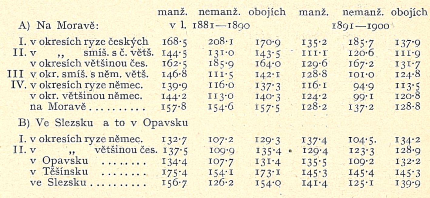 Zajímavé jest sledování úmrtnosti dítek manželských a nemanželských po odkojení. V okresích německých na Moravě a v celém Opavsku, ba v 1. 1881—1890 také v Těšínsku a ve smíšených okresích moravských s českou menšinou umírá nemanželských dětí poměrně méně než manželských, což odpovídá zásadě shora vyslovené, že větší úmrtnosti kojenců — a ta jest u nemanželských dětí značně vyšší — odpovídá menší úmrtnost dítek starších (1—5letých). Výjimku činí české Okresy: decimování řad nemanželských kojenců pokračuje i dále, tak že úmrtnost nemanželských dětí v českých okresích jest ve zmíněném věku dvakrát
