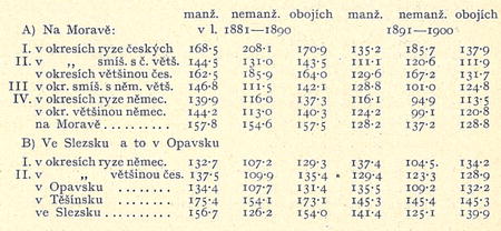 Tyto výsledky jsou velice interessantní. Pro Moravu a Slezsko platí pravidlo, že větší úmrtnosti kojenců .odpovídá menší úmrtnost dítek ve stáří od i do 5 let. Umírá jich tedy poměrně více v území českém na Moravě než v německém, v Těšínsku více než v Opavsku. Tím se stává, že v celku zemře v českém i německém území Moravy z.e živě narozených do 5 let stejný počet dítek; v tom ohledu liší se značně Morava od Čech, kde v českých okresích jsou poměry mnohem příznivější než v německých.