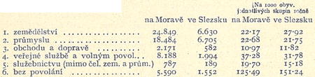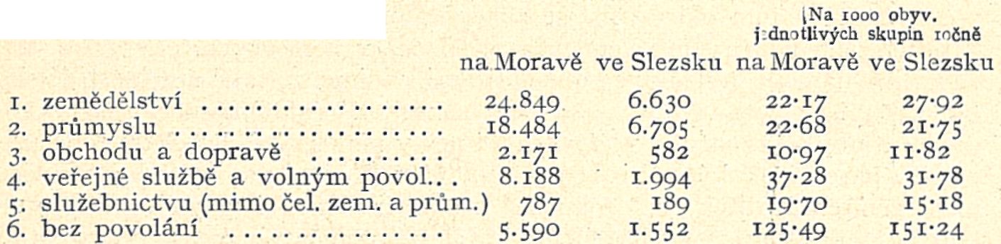 Vysoká čísla 6. skupiny nesvědčí o velké pečlivosti při zjišťování povolání zemřelých, čímž ostatní výsledky stávají se dosti nespolehlivými. Hledíme-li к oběma hlavním zaměstnáním, zemědělství a průmyslu, znamenáme na Moravě o něco vyšší úmrtnost u obyvatelstva průmyslového, která však vyvážena jest vyšší plodností, ve Slezsku pak značně vyšší u obyvatelstva zemědělského, u něhož jest také menší množství narozených dítek. Dále zasluhuje povšimnutí nízká úmrtnost u obyvatelstva živícího se obchodem a dopravou a velmi silná u 4. skupiny povolání, na Moravě více než třikrát a ve Slezsku téměř třikrát větší než plodnost této skupiny.