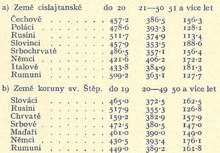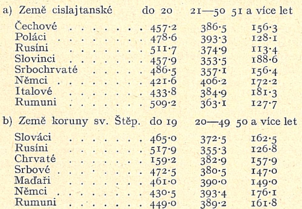 Důležité jest věkové členění národů. Niederle má příslušná data pouze pro rakouské Slovany (mimo Srbochrvaty); doplním je daty o ostatních národech a daty z Uher, která svým zpracováním se poněkud liší od rakouských. Dostanu tento přehled: Z 1000 obyv. mělo stáří