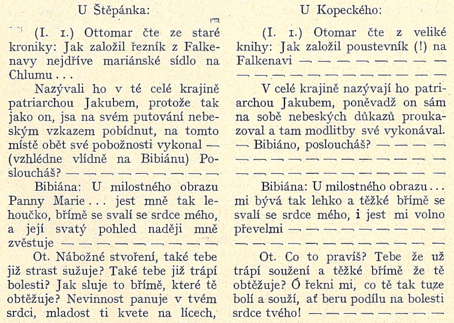 O tom, jak patriarcha a arciotec českých loutkářův Kopecký upravoval si hry, pokud je ovšem upravoval a pokud jich od vrstevníků nepřejal, dokáže názorně na př. hra „Loupežníci na Chlumu" v 5 jednáních3) tištěná 1862. Již r. 1815 tištěna byla v Praze táž hra s tímto názvem: „Laupež-níci na Chlumském wrchu, —• wlastenská činohra w pěti jednáních, dle německého rukopisu Pana Ginďřicha Kuny svobodně zčeštěná od Jana Nep. Štěpánka, u Frantisska Geřábka w železných dweřích", stran 77, a r. 1820 tištěna v druhém vydání táž hra s názvem „Loupežnjci na Chlumu, —. w Hradcy Králowé, pjsmem a nákladem Jana Host. Pospjssila, kragského a biskupského Impressora," stran 76. Jest přirozeno, že loutkář musil hru zhustiti, zkrátiti, a tak jednání I. má u Štěpánka 9 výstupův, u Kopeckého 6 II. u obou 8, III. u Štěp. 9, u Kop. 5, IV. 12, 8, V. 8, 3.