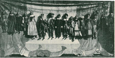 Rozšklebený čert, Faust v černé sutaně a s bílým „krógníčkem", sluha jeho s holou lebkou a mohutným plnovousem, svlečená loutka, princezna s vlečkou, král, tři radové, mladý sedlák, komorná, starý' sedlák s bílou beranicí z ovčí vlny a vtkožichu, služka (má dlouhý kabát, který se zapíná do zadu, okrouhlý' výstřih jesť"též v zadu, kdežto u předu nad koleny jest kraj rovný!), vůdce vojska s mohutným pérem, „umělec", ' dva Kašpárkové, smrt, dole „morská drůbeř",