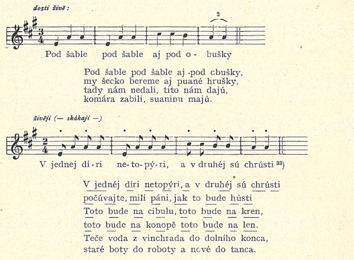 „Panímámo, panímámo, černý šorec máte, také-li nám do košíka kúsek slanin dáte. Tudy nám nedali, tudy nám dajú, zabili komára, slaniny majů."