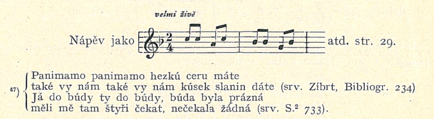 46) Zpíval J. S., chovanec Zem. střed, hospodářské školy v Přerově. 47) Vždy celá řada písniček v jedné melodii. 48) Krbaň, starý hrnec. Bart. Dial. Slov. 162.