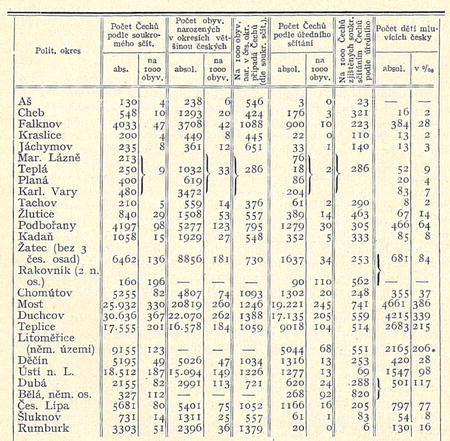 býti. Nepřímo na sílu menšin můžeme souditi z počtu oněch obyvatelů, jichž rodiště nachází se v okresích většinou českých; ovšem za základ se tato čísla také vzíti nemohou, poněvadž zajisté také z českých okresů přistěhovalo se na německé území něco Němců a naopak také v okresích německých se narodilo mnoho Čechů, hlavně kde české menšiny jsou usazeny již od delší doby. Posléze o síle českého živlu na území německém poučuje nás nepřímo množství dětí škol obecných a měšťanských umějících česky, ačkoli ani tu, zdá se mi, školní úřady velikou svědomitostí při zjišťování znalosti řeči u žactva nevynikají. Spojíme-li všecky tyto prvky dohromady, budeme moci utvořiti si správný úsudek o síle českých menšin a hlavně soukromé sčítání teprve oněmi ostatními momenty dojde náležitého osvětlení.