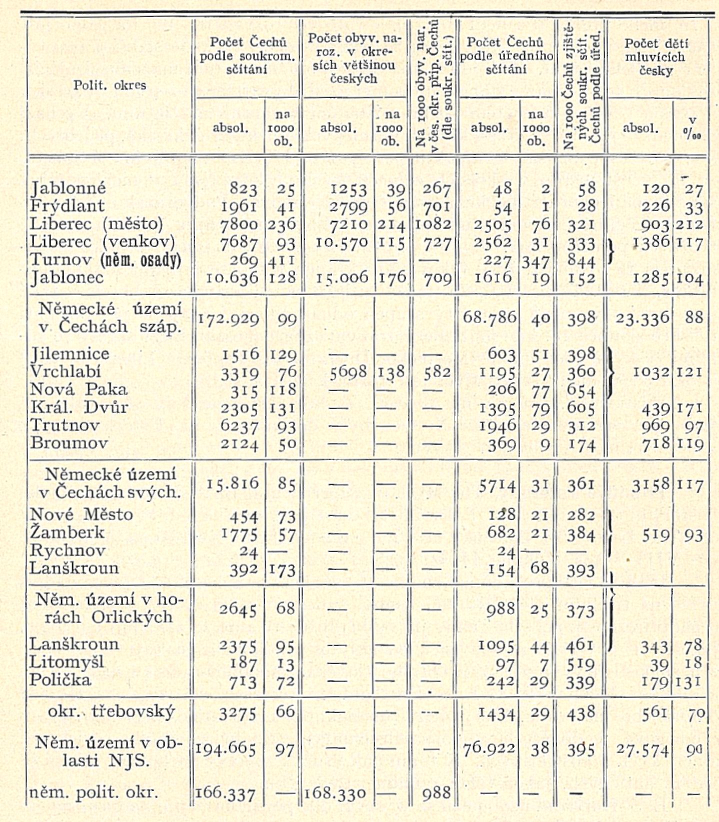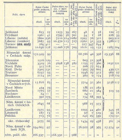 Úřední sčítání zná na německém území v Čechách severních, pokud spadá v oblast Národní Jednot}' Severočeské a pokud jest probíráno v obou knihách Šubrtových a jeho spolupracovníků celkem 76.922 Čechů. Soukromým sčítáním se počet ten zvýšil na 194.665, tedy o 117.743 duše. Uvážíme-li, že soukromým sčítáním počet Čechů v krajích německých nebyl úplně vystižen, jak ukazuje jasně 5. sloupec našeho přehledu, a připočteme-li k tomu ztráty naše při úředním sčítání na českém jihu (podle Hubky 17.895 osob,) můžeme směle tvrditi, že r. 1900 byl skutečný počet Čechů v království Českém aspoň o 150.000 vyšší, než jak byl stanoven úřední statistikou, a že tudíž česká kvóta jest aspoň o 2% vyšší, čili poměr Čechův a Němců v Čechách jest asi 65 : 35. Tvoří pak české menšiny 97% všeho obyvatelstva německého území. O správnosti těchto čísel svědčí i statistika školská, podle níž 9% dětí německých školních okresů této oblasti mluví česky.