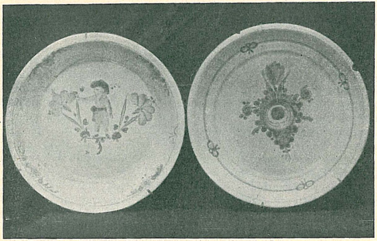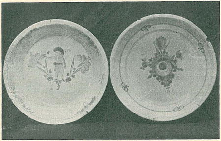 Talíře z konce 18. století malované barvami červenou, žlutou, zelenou. (Z mé sbírky.)