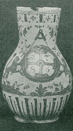 b) Džbán bučovického slohu z konce 18. stol., patřil mlynářskému cechu v Hodějicích.