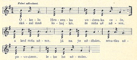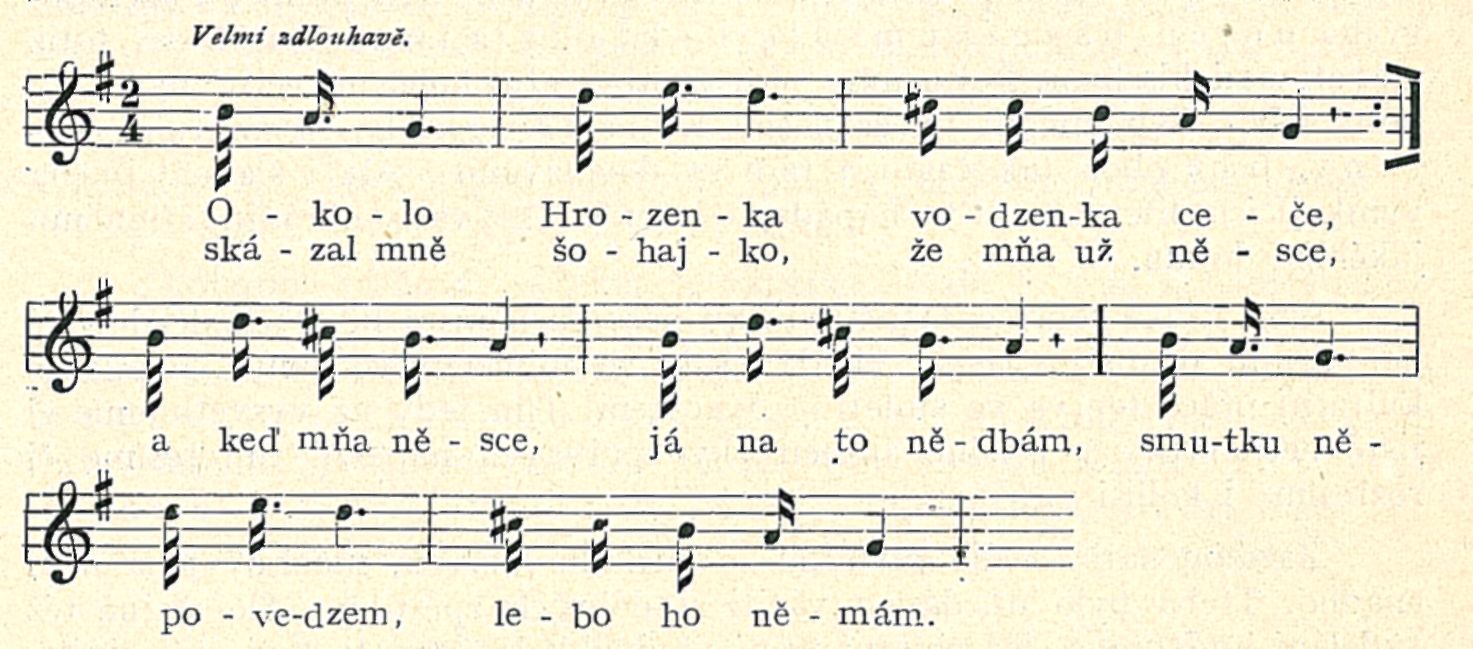 Co krásy zkoncentrováno v této nádherné písni! Jaký jest její nápěv? Hluboký, pravdivý. Má svůj kopaničárský výraz, přibarvený tóninou. Chtěl-li by někdo snad říci, že lydickou, nebyl by ještě v právu! Nebudeme se však s moudrým příti o lapalie. Sv. Ambrož jistě není původcem kopaničárské stupnice: g, a, h, cis, d, e, fis, g, tedy G-dur se zvýšeným IV. stupněm, ale aspoň nás tu interessuje. Třebas ne tím způsobem, jakým nás hudebně zajímají na př. naši bratří Slováci a Maďaři v Uhrách, ale právě tím, že pro náležitý hudební výraz nalezli i originální kopaničáři — aniž by byli hledali — vedle jiných různých výra? zových prostředků: tytéž tóniny, jichž používáno v g r e g o r i á n-