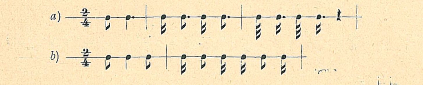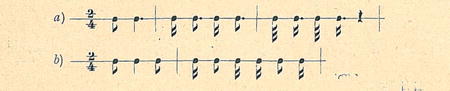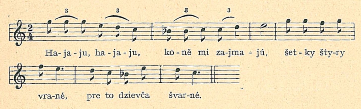 vtiskl neobyčejně typický výraz hudební, jinak — téhož jsou charakteru, jako některé kopaničárské písně „variačních" útvarů rytmických,5) event. melodicko-rytmických, podmíněných textem, na př.: