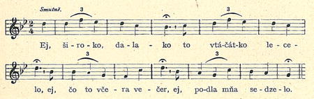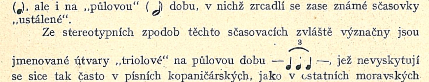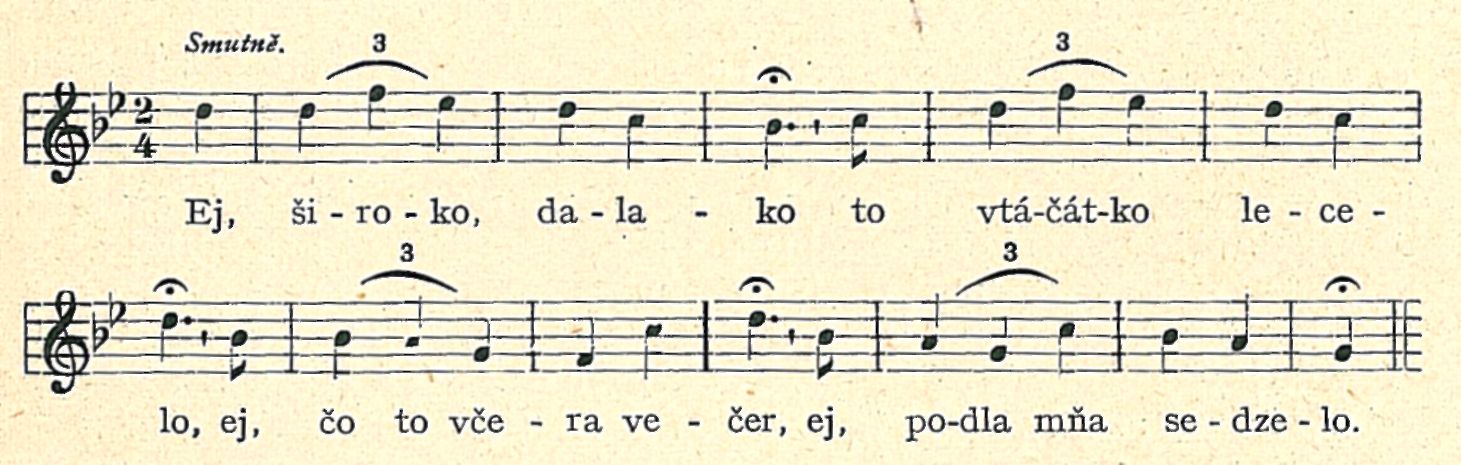 Zcela tudíž krátké písně — písničky! Jež v létě ozvěnou často se rozléhají po kopanicích. Zdánlivě i malicherný jsou a příliš (?) prosty, než — přece velmi významný. Iz nich nejlépe bylo by lze souditi na potenci tvůrčí síly kopaničárovy, kdyby ovšem aspoň z větší části nápěvně byly к disposici. Mimo to: písně tyto příčinou jsou oněch mnohých pcdobných, jimž vlastně život vdechly. Dokazují to nejrůznější, stereotypní zpodoby rytmické: nejenom častých útvarů „triolových" na „čtvrtinovou"