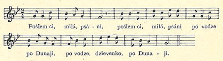 Jak pěkně vyjímá se rytmus v písních, takjesttedyipravdivý. Píseň jím oživuje, nebo i zmírá. Oživuje neobyčejně rytmem „čardášovým", jemuž velkého' podílu nelze upříti na slovenském a slováckém písňovém výrazu hudebním. S nápěvem však rytmus v celek splývá: účin písní slováckých i slovenských se proto zdvojnásobňuje. Takto zajímavá je na př. i píseň: