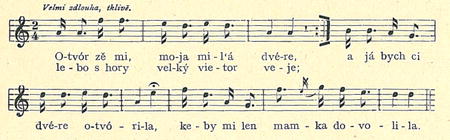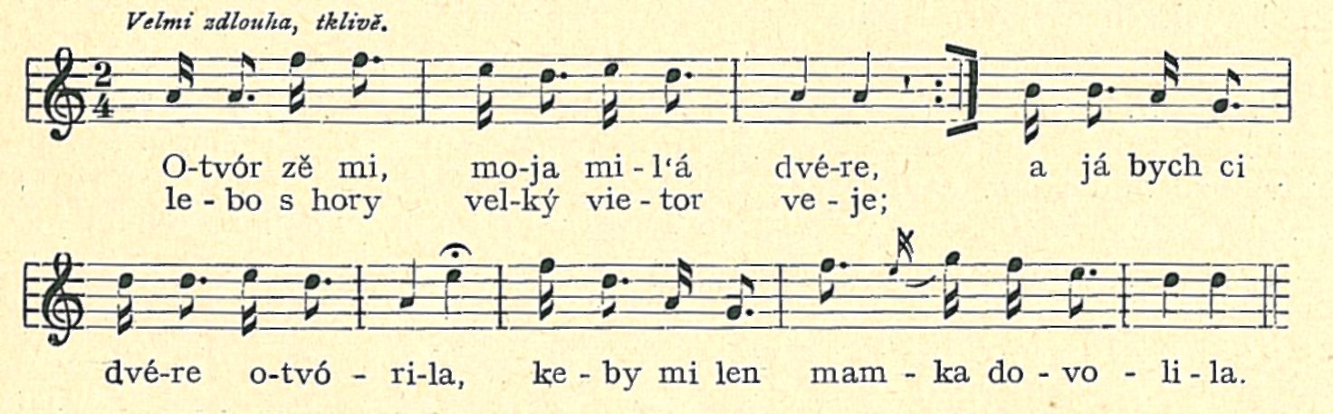 Mám dále na mysli zde rovněž zmíněné už sčasování a sčasovky, z nichž vlastně vyvinul se rytmus „čardášový": sčasovky kmenově též silně individuálních písní slovenských i slováckých — kopaničárských — jež stejně jsou národně ojedinělé a tudíž svého druhu. Taktéž rytmus „příznačný", jemuž nástrojově nejlépe vyhovuje cimbál. Na př.: