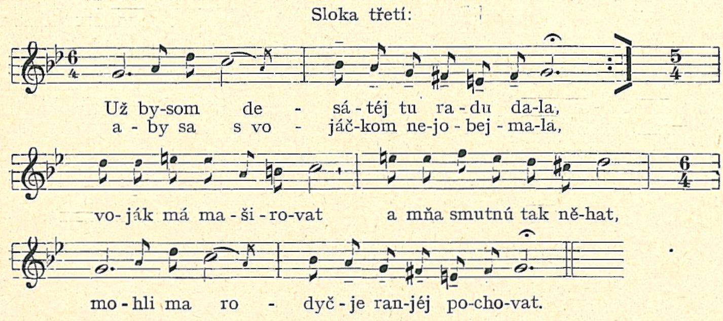 Spíše obráceně můžeme si to dovolit: ,,podceňovati" na př. ne jednu píseň umělou, ovšem — nikoliv ,,ve jménu", nýbrž jen v přirovnání s písní lidovou. Máme k tomu s dostatek důvodů, pro něž se obdivujeme lidu a jeho umění. ,,Proč jen nezpívá ta Destinnová písní lidových? Jak by se nám zavděčila! Proč pořád jen Toscu a zase jenom Toscu," slyšel jsem kdesi oprávněný stesk. Co znamená? Naivní lásku к písni lidové? Třebas, jak chcete. Ale i pak dlužno náležitě roz-lišovati písně lidové, t. j. cenu jejich. I když je všecky milujeme! Písně, jež tu v příkladech jsem, uvedl, nejsou arcif veskrz cenné — v tomtéž slova smyslu. Ale jsou charakteristické vždy něčím, a proto i tu nejslabší mám. rád. Jinak, kritickým nějalrým „hlubším" pohledem pozorovati písně kopaničárské? Cizí vliv písní z doby novější, svědčící, bohužel, jen o naprostém úpadku a neodvratné záhubě umění lidového, jest, myslím, všeobecný i známý. Důležitější jest však příčina vlivu toho — což nesmí se zaměňovati — živel cizí; písně cizí samy, na něž jsem tu л ve. _s_b írce své už poukázal. A vliv tónin církevních? Není ho v písních kopaničárských. Kdo zná původ kopanie ■a kopaničárů (viz na př. Wolného Kirchliche Topographie von Mähren, str. 316), nenapadne mu — vzhledem k dějináru umění církevního — o tom pochybovati.