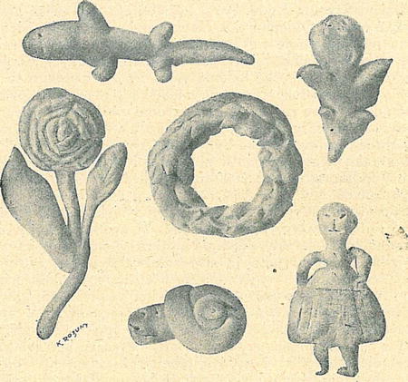 Další zajímavé kousky jsou točánky, esa a pramínková pletiva; prozrazují základní tvary ornamentální, kterých upotřebeno v naší archeologické bronzové technice.