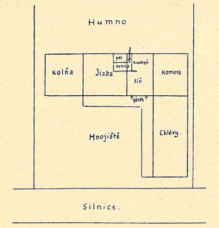 k tomu, že dole při cestě všechny domy stavěny jsou štítem a jizbou ven. Vchod mají pak buď z úzké, vedle domu vedoucí podsíně, do dvora otevřené, nebo z podsíně, která se nalézá v domě pod střechou a proměněna je tedy v úzkou zavřenou chodbu. Ve Vlčnově je vůbec více jednoduchých typů s jizbou a síní bez komory architektonicky vyznačené a místo ní s kolnou. Také bývá tam dvorek častěji obrácen do ulice, t, j. chlévy jdou napřed к cestě, ale obyčejně jen proto, že místo nestačilo na jiné rozvinutí dvorce. (Srv, obr. 7.)