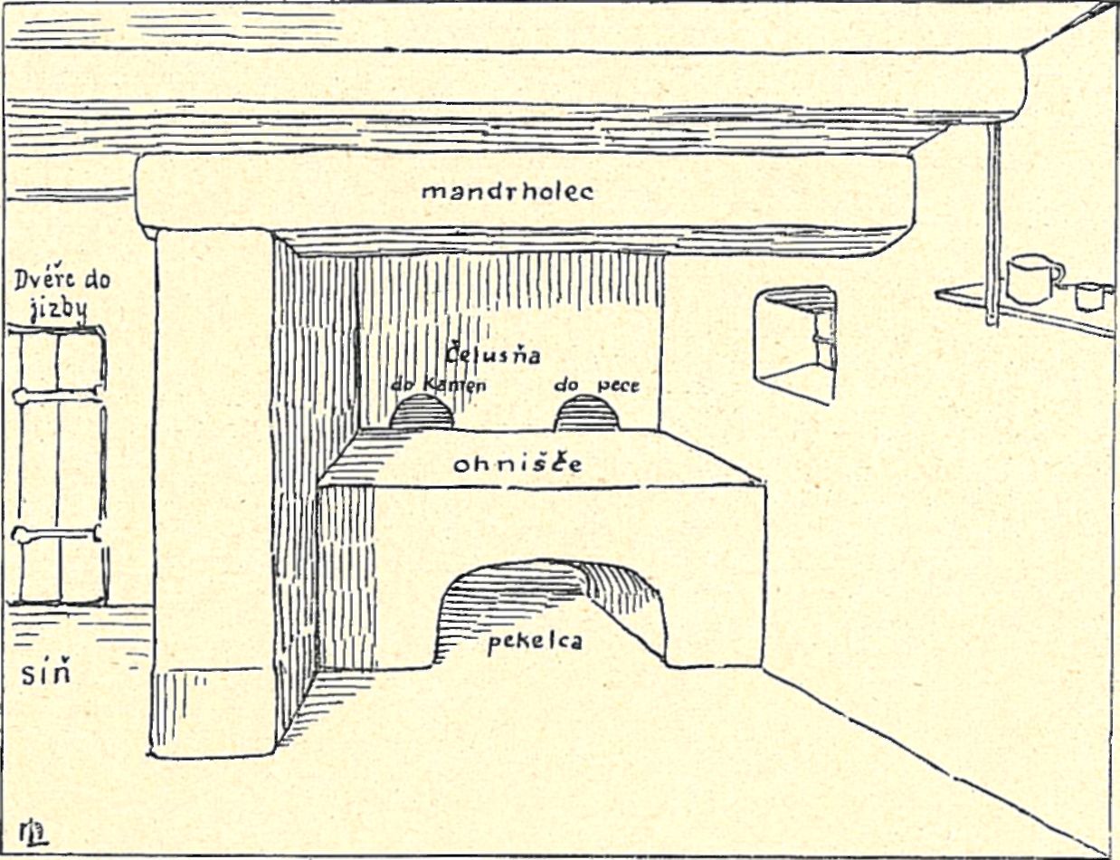 která odděluje jizbu, vidíme dva otvory, zv. čelusňa (plur.), jinde též, n. př. na Luhačovsku, č e 1 u s ť a, na kopanicích č e 1 u s c e.1) První z nich vede do kamen, druhý do peci. Vedle nich bývá však dnes na samém ohništi ještě třetí otvor pro kotel, který má potom zvláštní otvor na oheň v přední stěně ohniště, a z podkotlí zvláštní komínek. Jinak mají všechna tato ohniska pecní i kamnová společný komín. Celý strop kuchyňky je totiž otevřen (tedy není v ní stropu) a přeměněn v sužující se komín, jenž skrze podkroví jde do střechy a nad ní vyčnívá. Kouř z ohně v peci nebo v kamnech vrací se čelusněmi (jinde