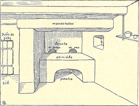1) Čelusňa značí otvory i samu stěnu, v níž jsou otvory. (V Šardicích se užívá i nominativu.) Stěna ta je ovšem zakouřená, ale i ta se čistí (líčí) aspoň v ostatky. Ve Veletínách na ostatky chodí dva občané (kominári) prohlížeti kuchyně a která hospodyň jich nemá v pořádku, musí se vykoupiti. Tentýž zvyk je patrně i jinde, na př. v Dolněmčí, kde tito kontroloři slují sáčí (Polášek). Popel z ohně a dřeva ukládají se pod ohnišče do pekelce (pekel с a); jinde sluji i pekélko. Je bud! uprostřed ohniště nebo po straně, někde jsou i dva vedle sebe.