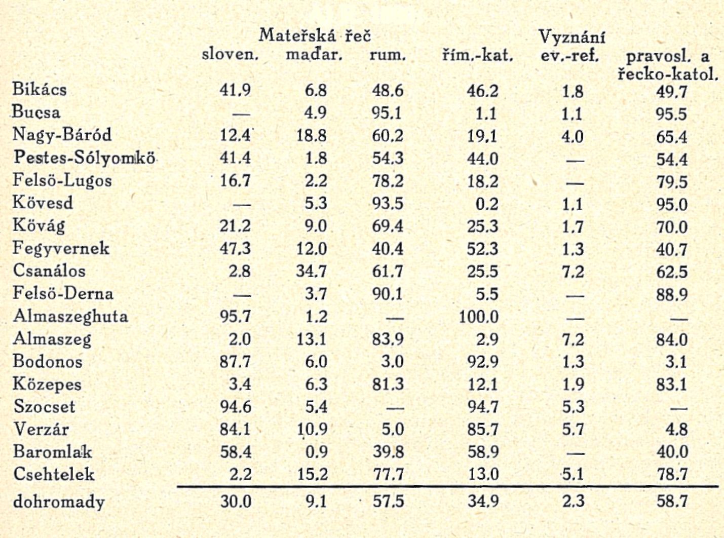 Sestavím tu přehled percentuelního zastoupení všech 3 národů a konfesí v těchto 18 obcích v rpce 1880 a 1900 a připojím vzrůst obyvatelstva, aby byl patrný vývoj obcí, jenž není bez vlivu na utváření poměrů národnostních. Při tom spojím pravoslavné a řeckokatolíky dohromady a užiji názvů pouze maďarských pro obce podle pramenů.