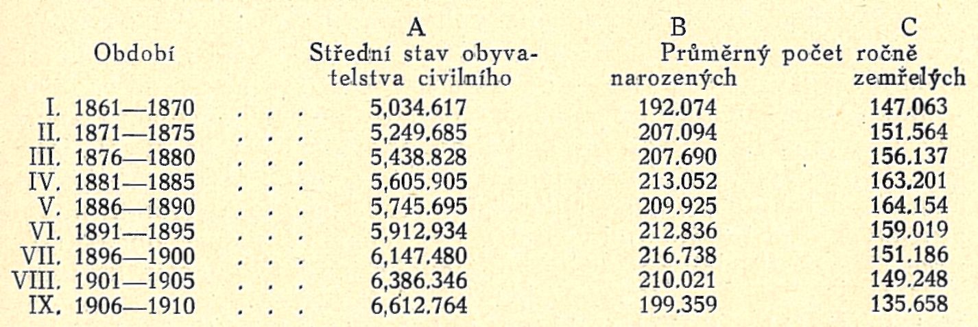 Ubývání porodů začíná u evropských národů (mimo Francouze) koncem let sedmdesátých, všeobecným se stává v letech osmdesátých minulého století a čím dále nabývá tím větší intensity, takže právě nyní žijeme v době největšího klesání plodnosti. Abychom mohli sledovati souvislost poklesu plodnosti s úbytkem úmrtnosti, začneme pozorovati přirozený vývoj v Čechách od let šedesátých, která patří ještě k oné periodě, v níž o všeobecném úmyslném omezování porodů není ještě řečí, kdy číslice natalitní sice se mění, ale změny ty souvisí s celkovým hospodářským stavem a způsobeny jsou vlivy, jež nesouvisí s vůlí, zasáhuouti nějak do tohoto přirozeného processu. Poněvadž jest nutno příhlížeti к úmrtnosti podle věku, abychom si tu zjednali jasno v těchto otázkách, a dřívější věkové složení českého obyvatelstva není nám tak přesně známo jako nynější, použijeme zde jiné methody statistické, než jaké jest obyčejně užíváno. Nebudeme hledati poměr počtu narozených a zemřelých ku počtu obyvatelstva v jednotlivých obdobích, nýbrž budeme sledovati vzrůst těchto tří veličin, vzájemně jej srovnávajíce. Za základ vezmeme průměrný roční počet narozených i zemřelých v desítiletí 1861—1870 a střední stav obyvatelstva tohoto období, jaký byl hypothetičky na konci r. 1865, jejž vypočteme podle známých statistických method z výsledků sčítání lidu v r. 1857 a 1869 a stejným způsobem získáme obdobná data pro každou následující pětiletou periodu. Východiskem našeho pozorování stanou se tedy nejprve tyto číslice: