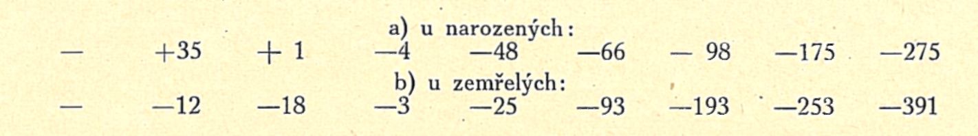 Tyto číslice znamenají: v letech 1871—1875 rodilo se v Čechách poměrně mnohem více dětí než v letech šedesátých, koncem let sedmdesátých a začátkem let osmdesátých jest přibližně opět týž stav jako v letech 1861—1870. Stoupnutí plodnosti (správněji: poctu porodů) počátkem let sedmdesátých jest patrně toliko jednou z oněch vln vzestupných a sestupných, jež v přirozeném vývoji národů pozorujeme a jejíž příčinu bylo by vypátrati detailním šetřením. Klesání porodů a tím i plodnosti začíná v Čechách v druhé polovině let osmdesátých asi tak kolem roku 1885 a stává se pak zjevem trvalým: vzrůstání počtu porodů zůstává stále více pozadu za přibýváním obyvatelstva, ba kolem r. 1900 vůbec se zastavuje a nastává ubývání novorozených, tento úbytek jest v období 1906—1910 mnohem silnější než v pětiletí předchozím. Koncem let osmdesátých jest vzrůst porodů menší než vzrůst obyvatelstva o 48 a tato diference pak úžasně roste, z počátku pomaleji, ale pak stále rapidněji, nejprve na 66, pak 98, na to již 175 a nyní dokonce na 275. Co jsem shora řekl, že žijeme právě v letech nejprudšího poklesu plodnosti, máme tu číslicemi přesně doloženo.