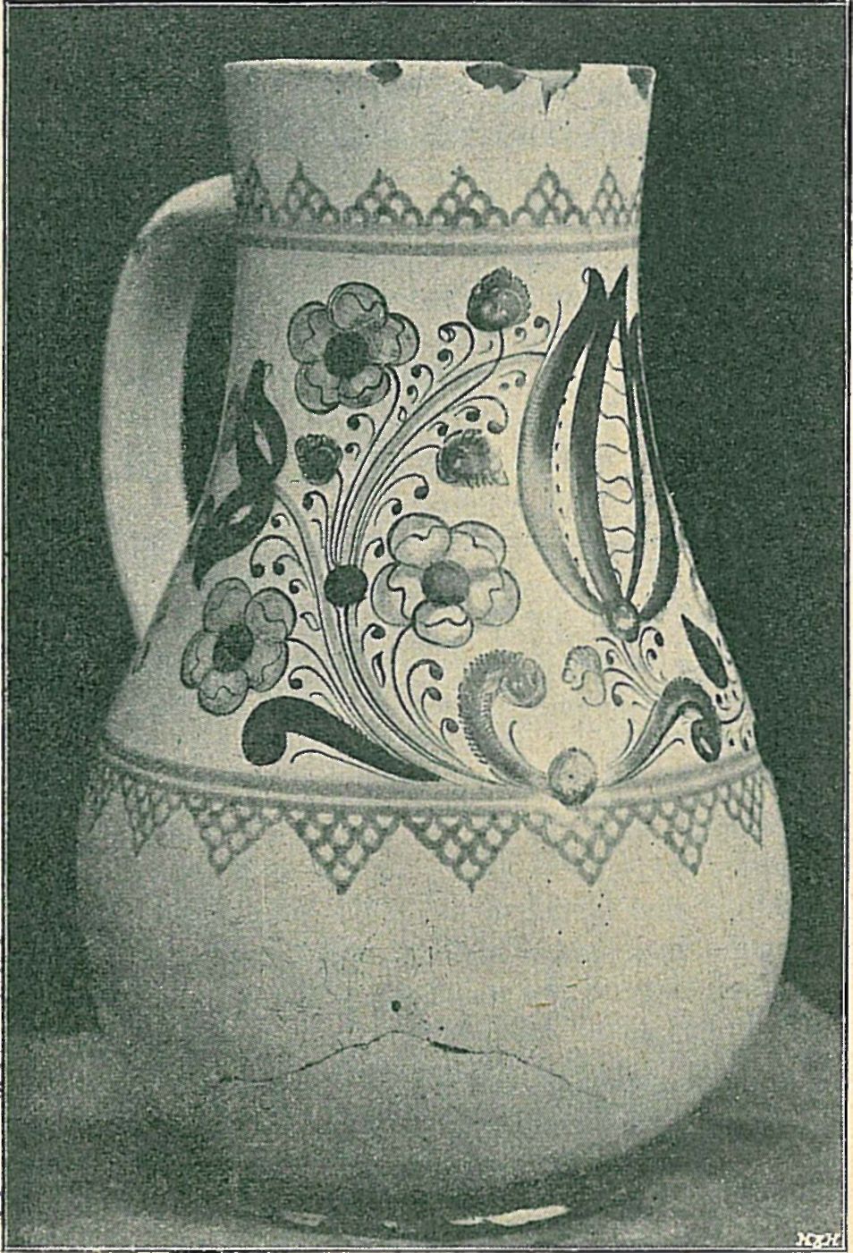 Druhý džbánek pravděpodobně vyrobený Penkertem jest z vyškovského musea, označený letopočtem 1700. (Vyobr. č, 3.) Není tak skvěle malován, výzdoba jeho skládá se z několika fialových styliso-vaných tulipánů a pestrých ratolestí, ojediněle v kruhu postavených kolem celého těla. Penkertovi jej připisuji proto, že byl nalezen ve vyškovském okolí, avšak kolem roku 1700 ještě džbánkářů ve Vyškově