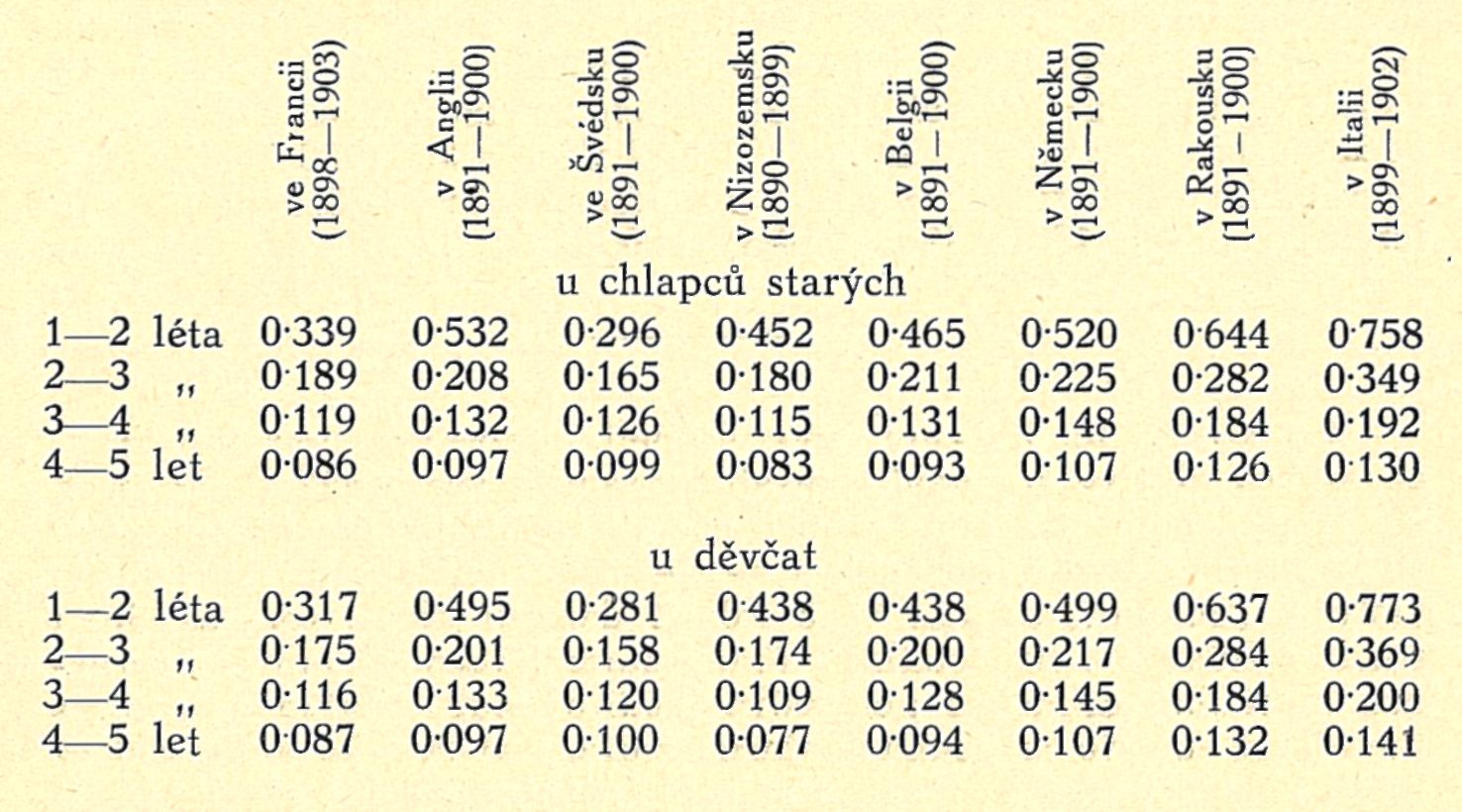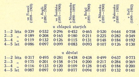 V podstatě týž obraz, jaký jsme právě získali, ukazuje nám i úmrtnost dospělejších dětí ve věku vyplněném z nej větší části návštěvou školy, jen s tím hlavním rozdílem, že protivy mezi kulturnějšími kraji západní a severní Evropy a méně vzdělanými východní a jižní nejsou tak příkré jako v dětském věku útlejším. Celkem si vyžaduje smrt ročně v zemích menší úmrtnosti asi 03—0-4% dětí 5—151etých (v období 1896—1905), ve státech s převahou analfabetů V-2%—1% i více.