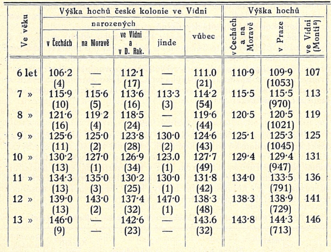 6) Do počtu dítek ve Vídni narozených byl v našich tabulkách pojat též nepatrný počet dítek z nejbližšího okolí Vídně, t. j. z nynější Velké Vídně a z Dolních Rakous. Nehledě к nedostatečnému počtu dítek šestiletých, pozoruje se výše uvedený zjev s velkou pravidelností ve všech ročnících, vyjma dívky 12 a 13leté.