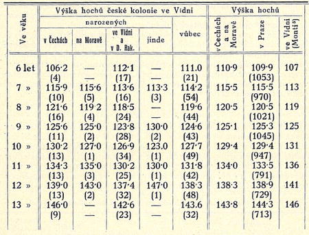 Nejnápadnější zjev pozoruje se však při srovnání dítek české kolonie mezi sebou: předem dalo by se očekávati, že děti do Vídně přibylé budou se ve vzrůstu celkem rovnatí dětem vídeňským, jichž rodiče nebo prarodiče pocházeli z těchže končin, t. j. z jižních Čech a z jižní Moravy. Ve skutečnosti zůstávají české děti ve Vídni narozené ve vzrůstu pozadu proti těm, které jsouce v Čechách a na Moravě narozené, v útlém mládí do Vidmě přibyly.6) Dle toho zdá se, že přírodní a sociální poměry t, zv. „milieux" ve Vídni působí na přibylé obyvatelstvo v tom ohledu opačně, než milieux Severní Ameriky (dle zkoumání Boasových). Bylo by možno menší vzrůst českých dítek ve Vídni rozených (u srovnání s dítkamí z Čech a z Moravy přistěhovallými) vysvětlit! prostě hygienickými a sociálními poměry velkého města; ale vlivy ty nejsou jednoduché, ani všude stejné, naopak složité a rozmanité, tak že nevedou všude к stejnému výsledku. Quételet, Villermé,