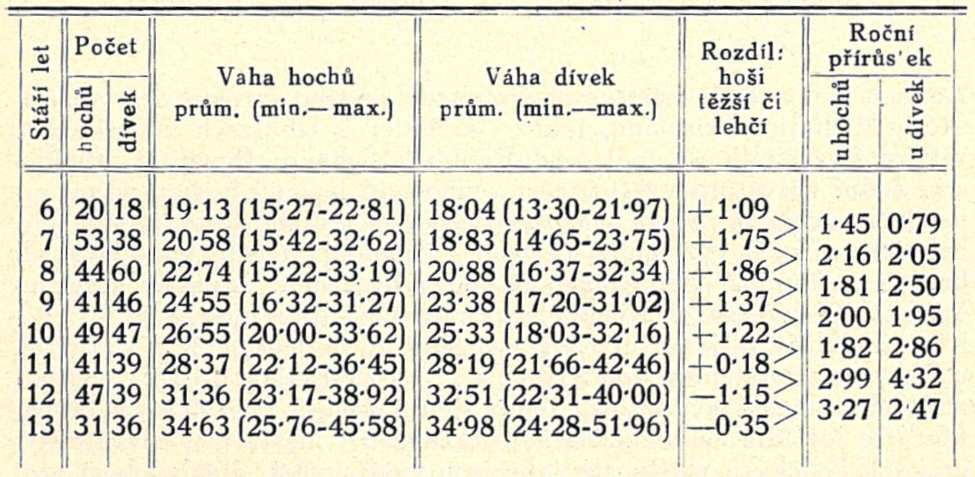 Roční přírůstek se okolo 8. až 9. roku poněkud snižuje, ale později— a zvláště po 11, až 12. roce — zvětšuje. Také podle změn váhy tělesné dospívají dívky asi o jeden rok dříve než hoši. Rozdíl mezi hochy a dívkami se také ohledně váhy stále zmenšuje, tak že dívky po 11, roce v tom ohledu předčí hochy stejného stáří, a to jak v průměrných číslicích tak v dosažených hodnotách maximálních.