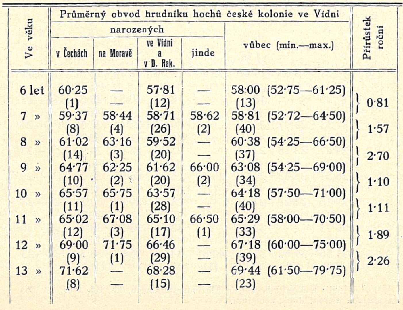 Při srovnání českých dítek vídeňských mezí sebou vychází opět na jevo, že hoši i dívky narozené v Čechách a na. Moravě předčí vídeňské Čechy téhož stáří, a to — mimo ročníky hraniční (6. a 13. rok), kdež odchylky jsou jinak vysvětlitelný, — zcela konstantně. Zjev tem dlužno patrně stejným způsobem vysvětlit! jako rozdíly ve výšce těla.