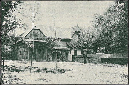 Obr. č. 6. Menší chalupa úplně uzavřená a na všech stranách stejně vysoká; dvůr je o málo širší vrat; na pravo članový plot.