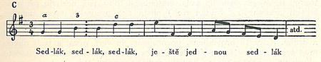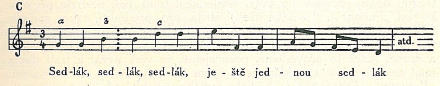 Nemohu si odepříti poznámky o této písni, jež pro nás obyčejně jedině představuje tanec „Furiant". Vždy mi bylo nápadno, že vlastně text správně nedeklamuje; slova „eště jednou sedlák" totiž deklamována jsou též v rytmu furiantském (trocheje), ač mají býti již