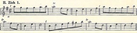 Jako odlišný případ uvádím svůj zápis „zeleného kousku" z Chodska (klarinetová variace). Ale i ten lze, přihlédneme-li pozorněji, pova-žovati za vzdálenější instrumentální variant tance Rittersberkova. Aby bylo možno tento poslední zápis srovnati s tancem Rittersberkovým, uvádím jej též v D-dur, ač originál jest v Es-dur (tónině malého klarinetu a dud).