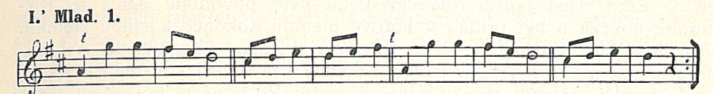 Jest ihned patrno, že tento tanec jest jen druhý díl tanců dvojdílných. Jest tedy forma jeho vzhledem к předešlým ]: b b' :|. Z toho důvodu také, že zdá se býti jen zlomkem tance dvoudílného, uvádím jej až na konec, ač budu jinak vždy tance jednodílné formy jakožto jednodušší uváděti napřed.