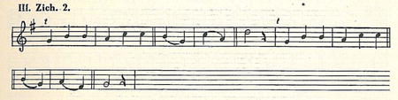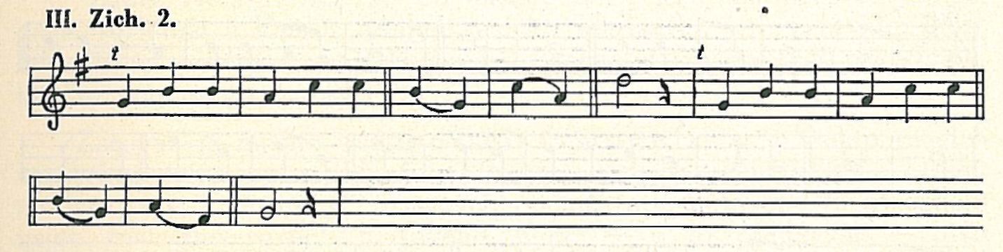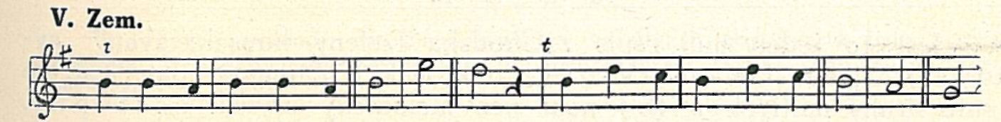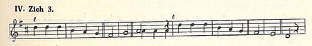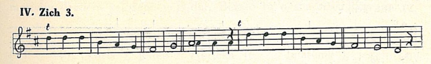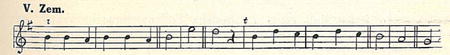Třetí melodický útvar objevuje se v tanci, zapsaném Zemánkem (Chr. 480 nahoře, „kytička"). Notace Zemánkova je rytmicky správná, jen podána veskrze v osminách. Tento motivek počíná tercií a vyšinuje se přes sextu ke kvintě. Uvedu jej v tónině originálu.