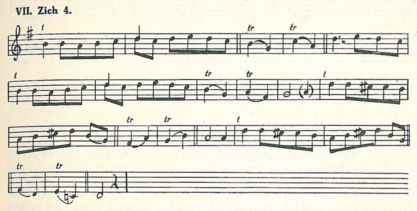26) Takové modulace do dominanty, vyžadující, aby kvarta byla zvýšena o půl tónu, jsou dudy dobře schopny: užije se při hraní tohoto tónu jiného hmatu (odkryjí se dvě dirky).