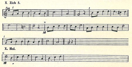 Výše uvedené schéma jest základem pro jeden tanec mých zápisu z Královéměstecka („kozel"), jeden z C. Lidu, dle něhož jsem skupinu pojmenoval (1897, 369, „hrábě"), jeden z Hořicka (č. 6, „mateník") a dva tance Holasovy (V. 275, „vrták" a 278, „směsek"). Jsou to vesměs malé melodické varianty, nejvíce ve vložce odlišné. Pokud se rytmických oprav zápisů týče, platí totéž, co při předešlé „sýkorce". Zápis z C. L. zdá se býti — pro svou harmonickou monotonii — i melodicky chybný, snad byl psán jen dle paměti. Uvedu z nich příkladem zápis svůj a pak nejvíce odlišnou „vložku" Holasovu (V. 278).