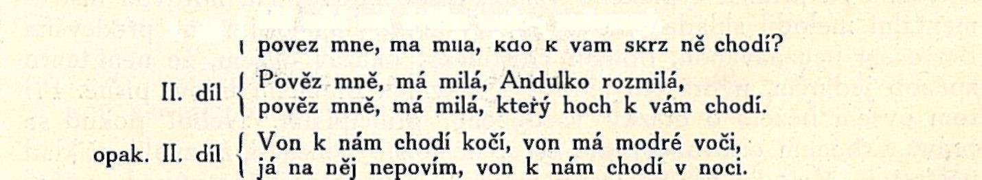 Znamenité příklady této formy poskytují dva tance Rittersberkovy (č. 8 „vosňák" a č. 16 „sedlák"). K nim druží se tanec z Hořicka (č. 11 „mateník"), jehož forma jen zdánlivě je rozšířenější, poněvadž druhý díl celý jest opakován а к němu připojen další text: