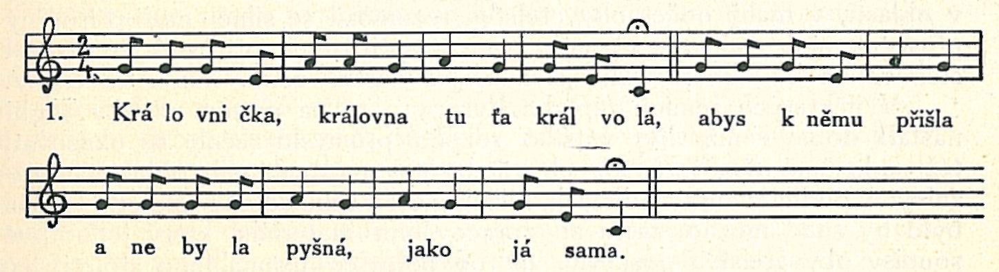 Pokud vím, nezapsal ani Klvaňa ani Bartoš úplného textu „Krá-lovniček" slovenských s nápěvem. Uvádím jej zde, jak jsem jej zachytil před několika lety ve Veletínách u Uherského Brodu, kde na svatodušní pondělí, v týž den tedy, kdy se koná „jízda králů", obcházejí po dědině malé dívky „královničky" svátečně ustrojené jako družice s vínky na hlavě a v bílém šorci. Před každým domem zpívají uvedenou dále píseň a dostanou nějaký dárek. V okolních dědinách (Drslavicích, Hradčovicích, Lhotce, Podolí) už tyto královničky nechodí. Píseň zní: