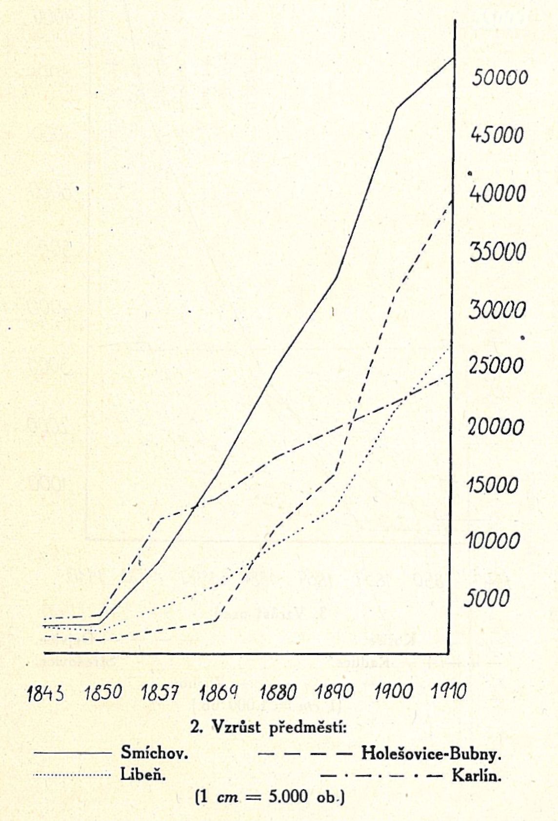 nazvati štěstím, že ještě dosti brzo aspoň těch nejvýznačnějších svahů ujala se péče o okrášlení a ozdravění města; jinak by snad i ty byly podlehly potřebě podnikatele stavebního. Podobný kulturní význam mají aspoň z části nynější a bývalá opevnění i pozemky zaujaté vojenským erárem. Svahy i dosti příkré pokrývají se domy a ulice zhusta v serpentinách zmáhají ostrý sklon. Blízkost к ústředí města zdá se býti nej-důležitějším momentem v posledním desítiletí, plocha jednotlivých předměstí zastavuje se až na hranice možnosti a pak teprve vlna nového přílivu obyvatelstva vrhá se na nejbližší obce okolní. Jen tam, kde výborné spojení dopravní vyvažuje blízkost města, nastupuje jisté odpoutání obyvatelstva od přehustě obydlené oblasti velkoměsta, nastává rozvoj